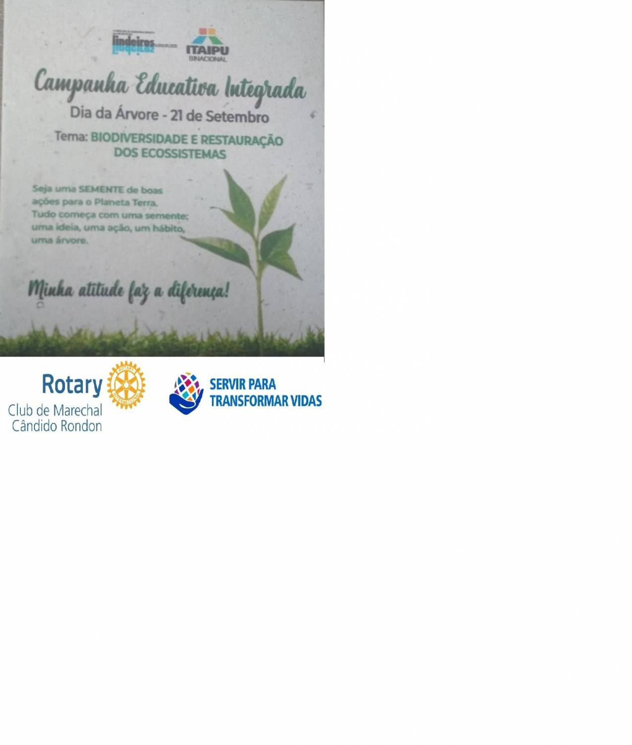 O Rotary Club de Marechal Cândido Rondon em parceria com o Rotakids MCR, secretária de Agricultura, Educação, Itaipu e Lindeiros. realiza dia 18 de setembro realiza a entrega de papeis sementes na rotatória em comemoração ao dia da árvore.
