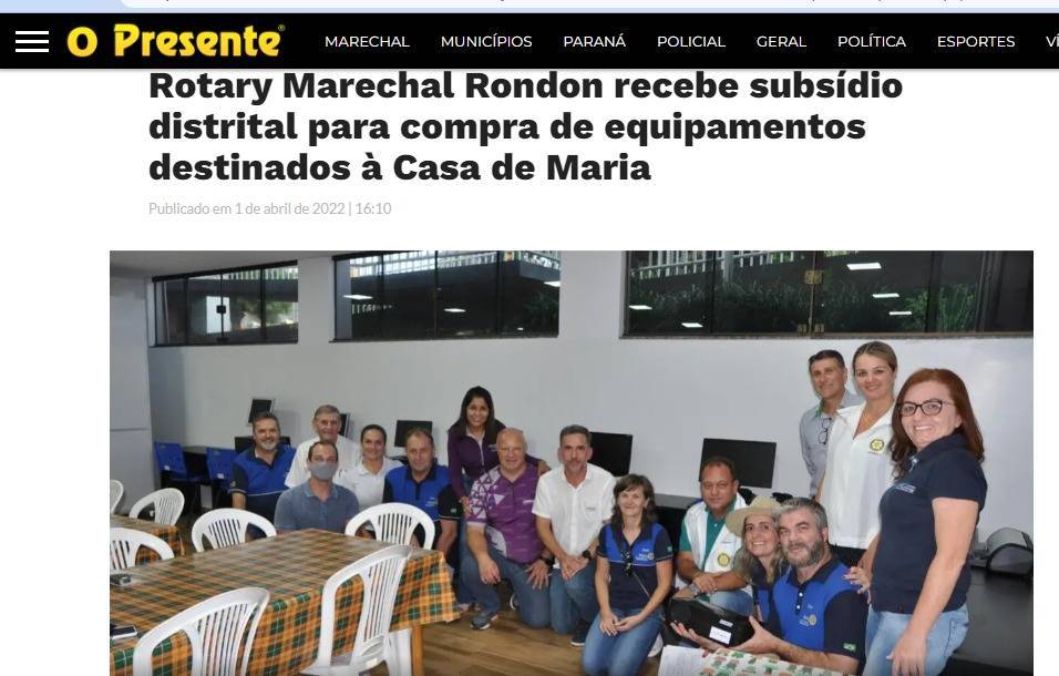 O Rotary Club Marechal Candido Rondon, através de Projeto, foi contemplado com Subsidio Distrital no valor de R$ 8.157,50 para compra de equipamentos destinados a Casa de Maria.