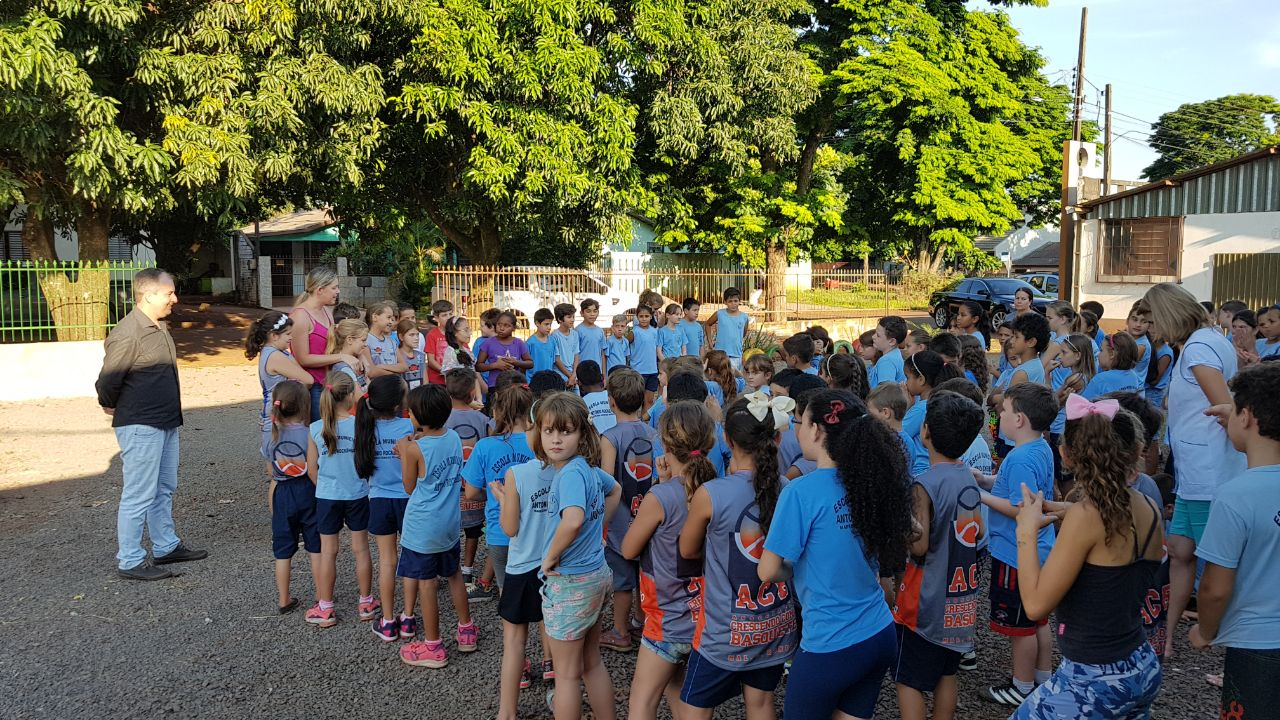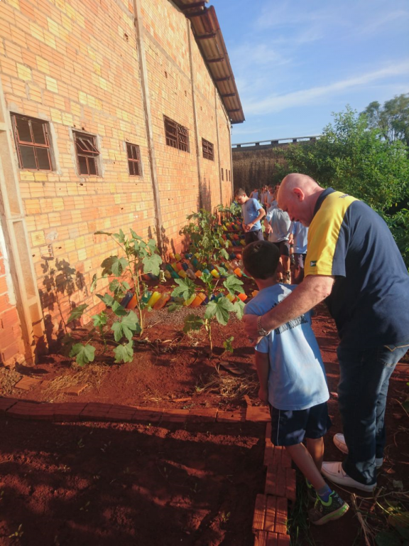 A escola pintou a frente do salão e nos fundos fez uma horta e o Rotary Club Marechal Cândido Rondon conseguiu os equipamentos para o parquinho e readequou o local com reboco de muro e pintura de cerca e parede da lateral do salão que dá acesso à horta.