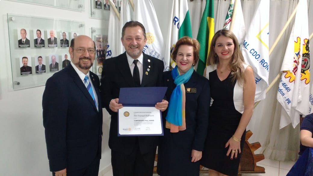 Durante a festiva da visita oficial da governadora Sônia Taube Linero aos clubes de Rotary de Marechal Cândido Rondon, foi entregue mais um título de Companheiro Paul Harris. Trata-se de Ildo Hoffmann, do Rotary Club de Marechal Cândido Rondon. Ele recebeu a homenagem das mãos da própria governadora Sônia, acompanhada do seu esposo Luiz Fernando Linero.